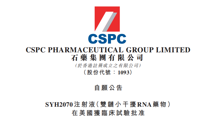 10月9日,石藥集團(tuán)(1093.HK)宣布,本集團(tuán)自主研發(fā)的化學(xué)1類新藥SYH2070注射液(雙鏈小干擾RNA(siRNA)藥物)(下稱:該產(chǎn)品)已獲得美國食品藥品監(jiān)督管理局(FDA)批準(zhǔn),可在美國開展臨床試驗(yàn)。該產(chǎn)品亦于2025年9月獲得中華人民共和國國家藥品監(jiān)督管理局批準(zhǔn)在中國開展臨床試驗(yàn)。