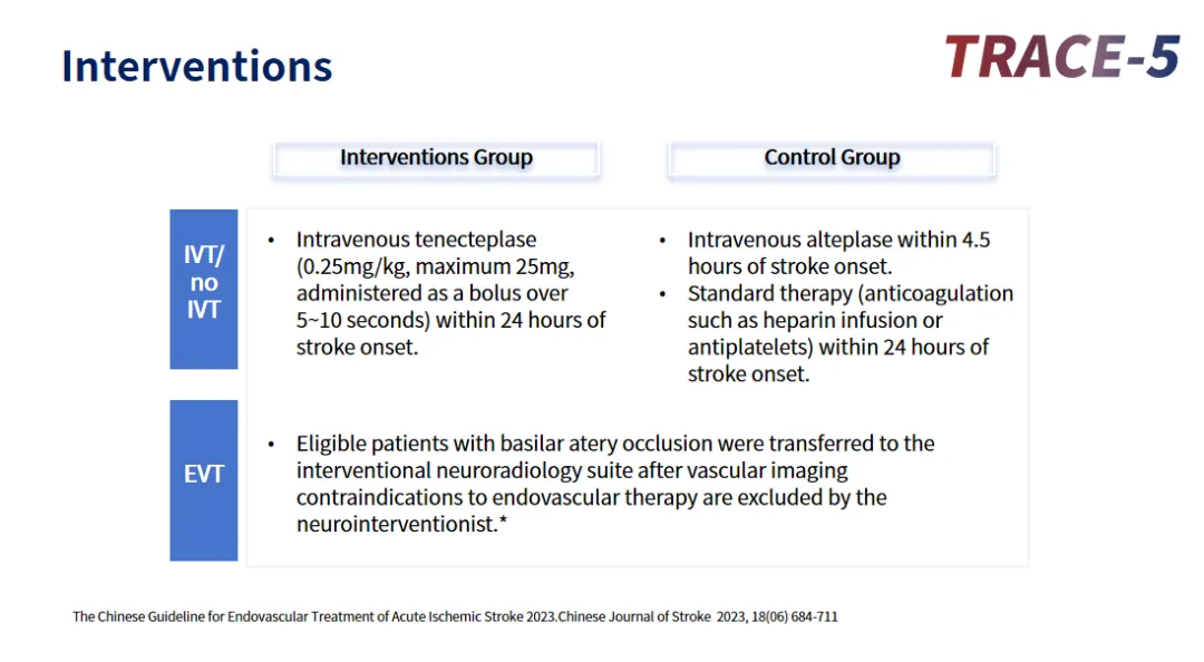 TRACE-5研究是由首都醫科大學附屬北京天壇醫院王擁軍教授團隊發起的一項多中心、前瞻性、開放標簽、終點盲法、隨機對照臨床試驗。該研究旨在探究在發病(或臨床表現惡化/昏迷)或距最后正常時間24小時內基底動脈閉塞的卒中患者中使用替奈普酶靜脈溶栓的有效性和安全性。主要納入癥狀發生后24小時內、磁共振血管成像(MRA)/ CT血管成像(CTA)提示基底動脈閉塞或次全閉塞,24小時內是否接受取栓可由當地醫生決定。研究主要結局為3個月時mRS評分為0-1分(無殘疾)或恢復至基線mRS(如果發病前的基線mRS為2-3分)的患者比例,安全性結局包括癥狀性顱內出血(sICH)患者的比例90天內的全因死亡率。