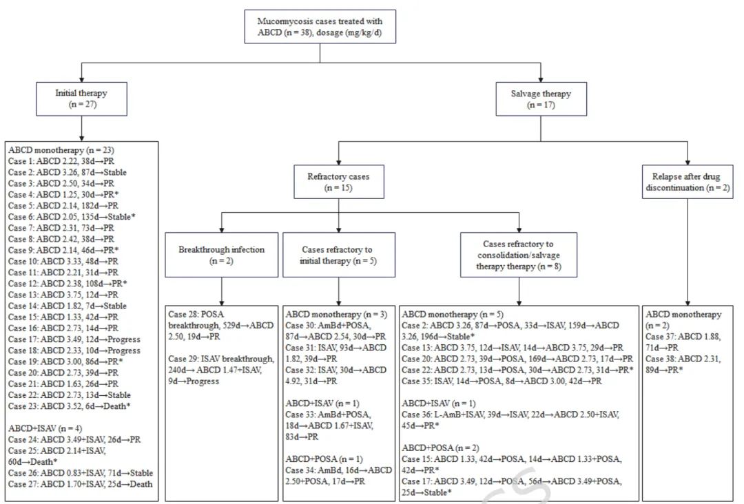本研究為一項單中心、回顧性、真實世界研究,納入2021年8月至2024年4月在華山醫(yī)院接受ABCD治療的38例毛霉菌病患者。研究旨在評估長期、低劑量ABCD在初始治療和挽救治療中的療效與安全性,并分析影響90天預后的因素。
